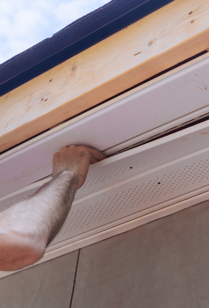 Soffit is the material located underneath the overhang of your roof. It helps ventilate your attic, allowing air to circulate and preventing moisture buildup that can lead to mold or rot.